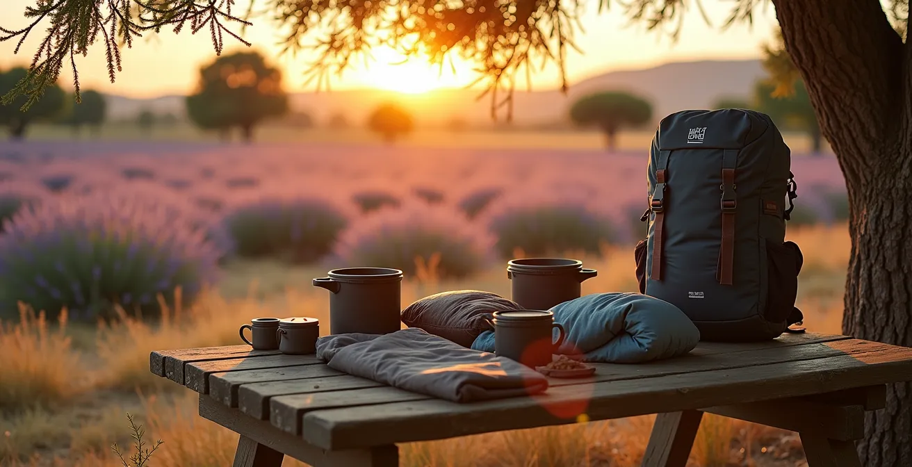 Faire sa valise pour la Provence est un exercice d’équilibriste. Le cliché de la région se résume souvent au soleil et à la chaleur, mais ce serait une erreur de ne prévoir que des shorts et des t-shirts. Le secret, comme pour le matériel, est d’adopter une approche modulaire : le fameux principe de l’oignon. Il s’agit de superposer des couches fines et techniques plutôt que de s’encombrer d’un unique gros pull. Cette méthode est d’autant plus pertinente que la majorité des campeurs recherchent un certain niveau de confort, avec près de 67% d’entre eux privilégiant des emplacements avec hébergement équipé, ce qui libère de la place pour des vêtements mieux adaptés.